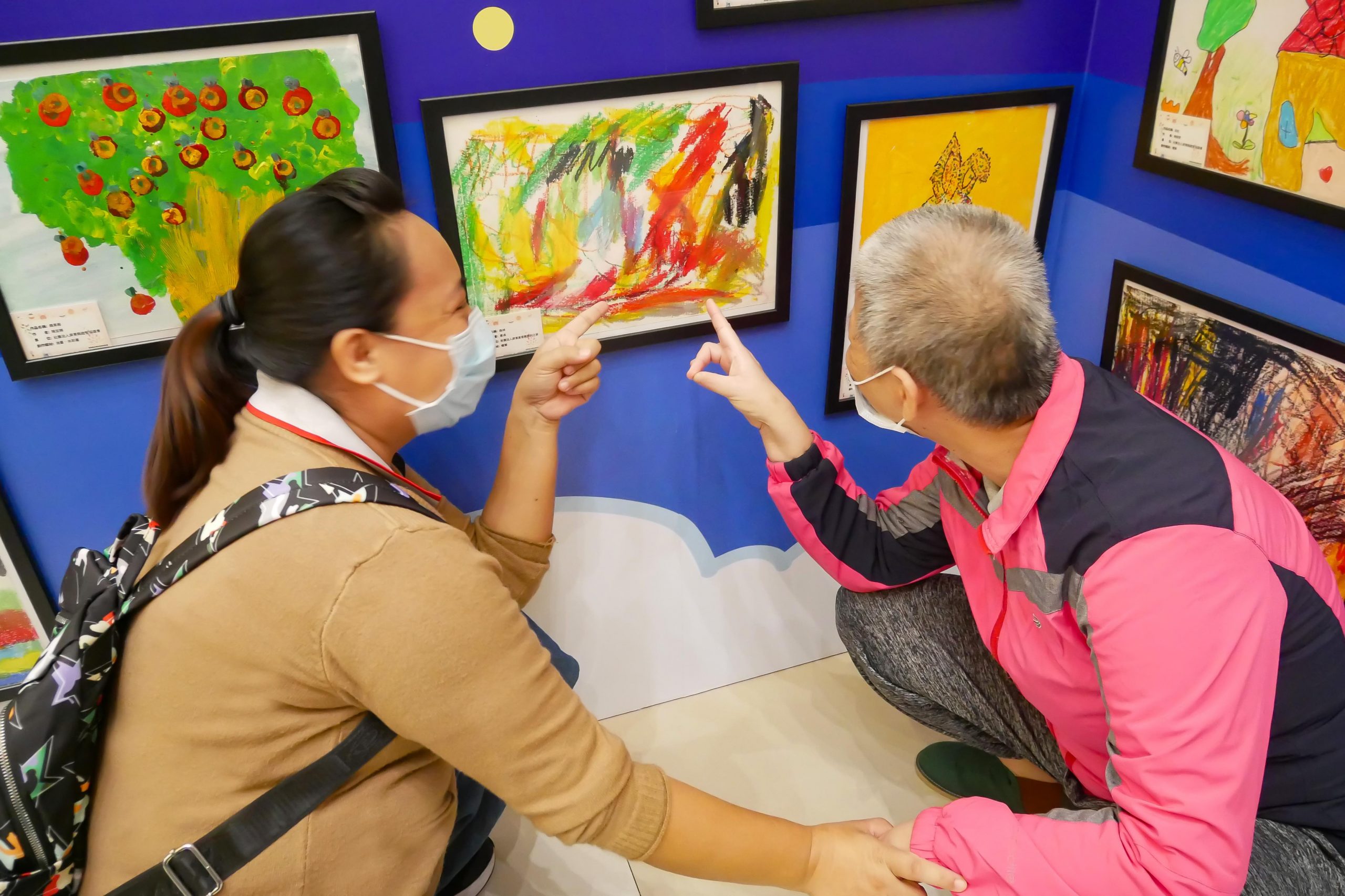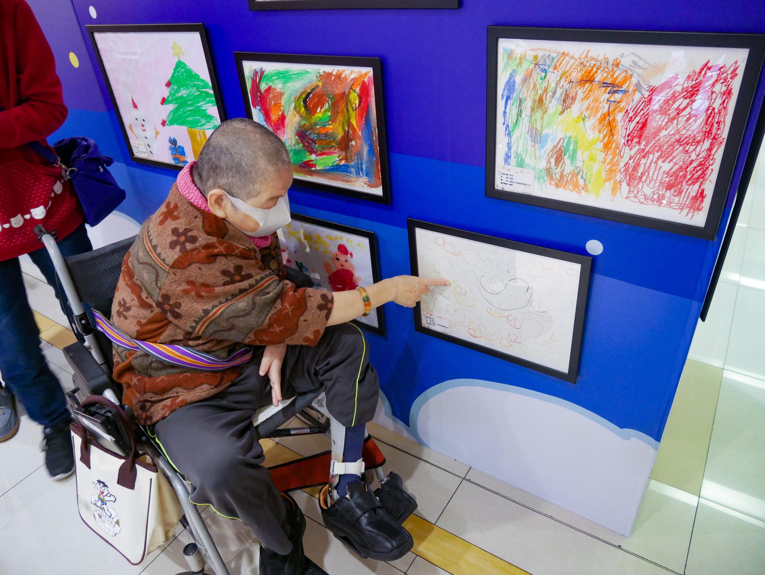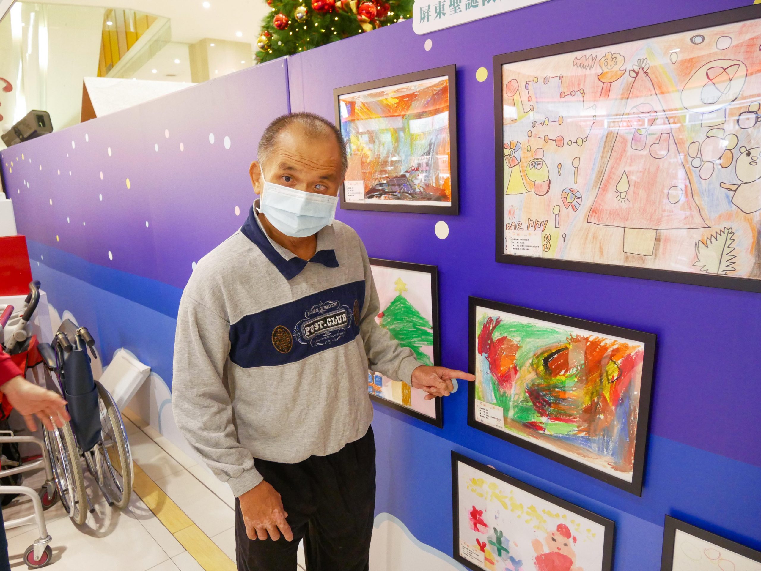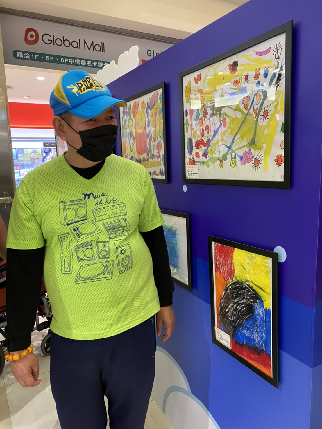本院的服務使用者人君,把小時候到海邊遊玩時看到海洋的景象運用色彩來表現,他說:畫作中藍色部分代表大海綠色則是代表海草,藉由畫作將和家人出遊的美好回憶記錄下來。對於自己的作品第一次能在公共場所展出感到非常開心。對於身心障礙者而言,提供一個舞台機會讓其努力被社會大眾所看見,就是對他們最大的肯定。感謝屏東大學US計畫,積極地將大學能量帶入社會中需要協助的群體,並發揮特殊教育中心之專長,讓學生將在校所學能夠運用在實務的場域中,為學生就業之最後一哩路做好準備,同時也能夠與我們一起為照顧身心障礙者盡一份心力。