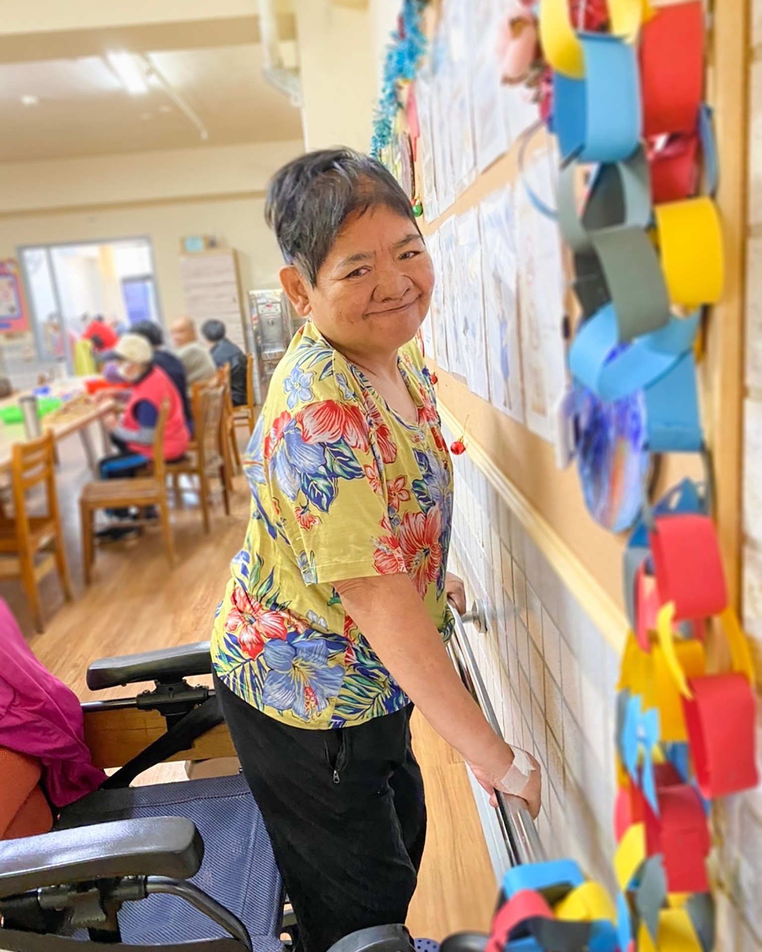 每次和阿花打招呼,她總是會用大大的微笑來回應,平時最喜歡人多熱鬧的地方,特別是音樂及舞蹈,只要阿花聽到排灣族的古調時,嘴巴就會哼著輕快的母語隨著音樂舉高雙手擺動,自然而然的展現排灣族文化之美。