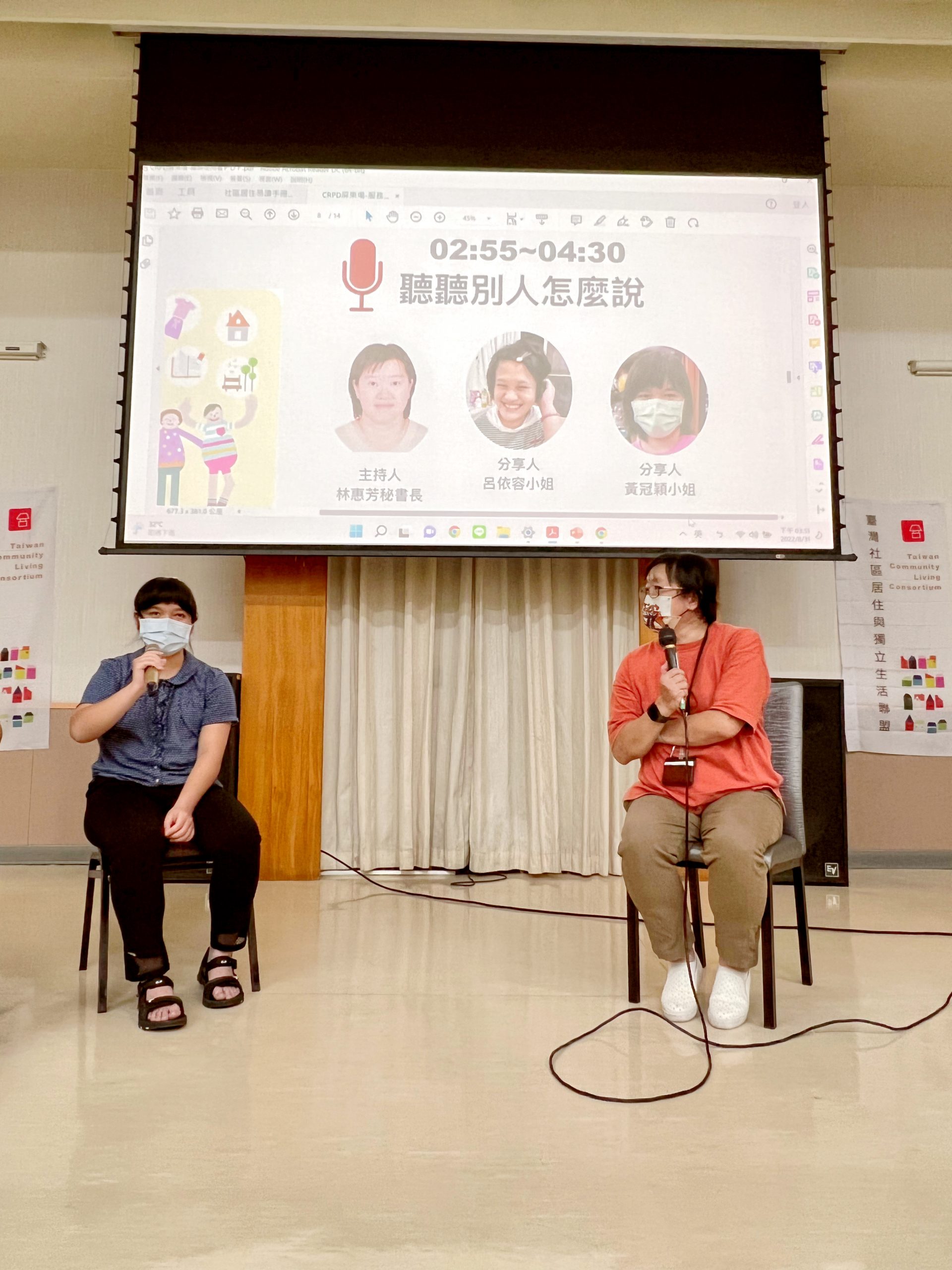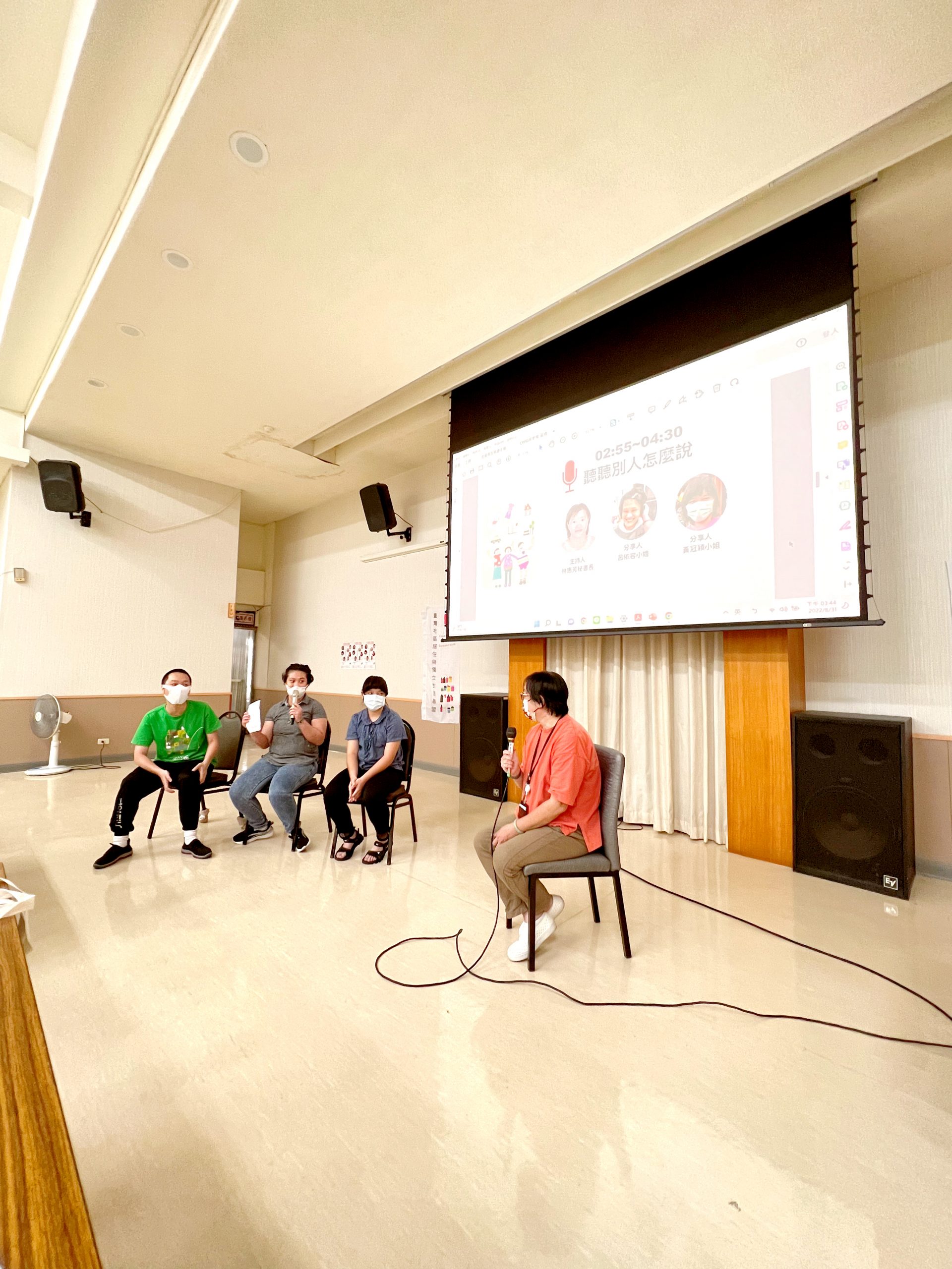 工作坊的其中一個環節,講師邀請了院內的身心障礙者上台分享到社區生活時,他們認為應該要做哪些準備以及執行上是否會遇到哪些難題?代表上台的依容、冠穎以及晉成雖然是第一次上台分享,卻也侃侃而談他們在學習自立生活時印象最深的挑戰以及遇到的問題。