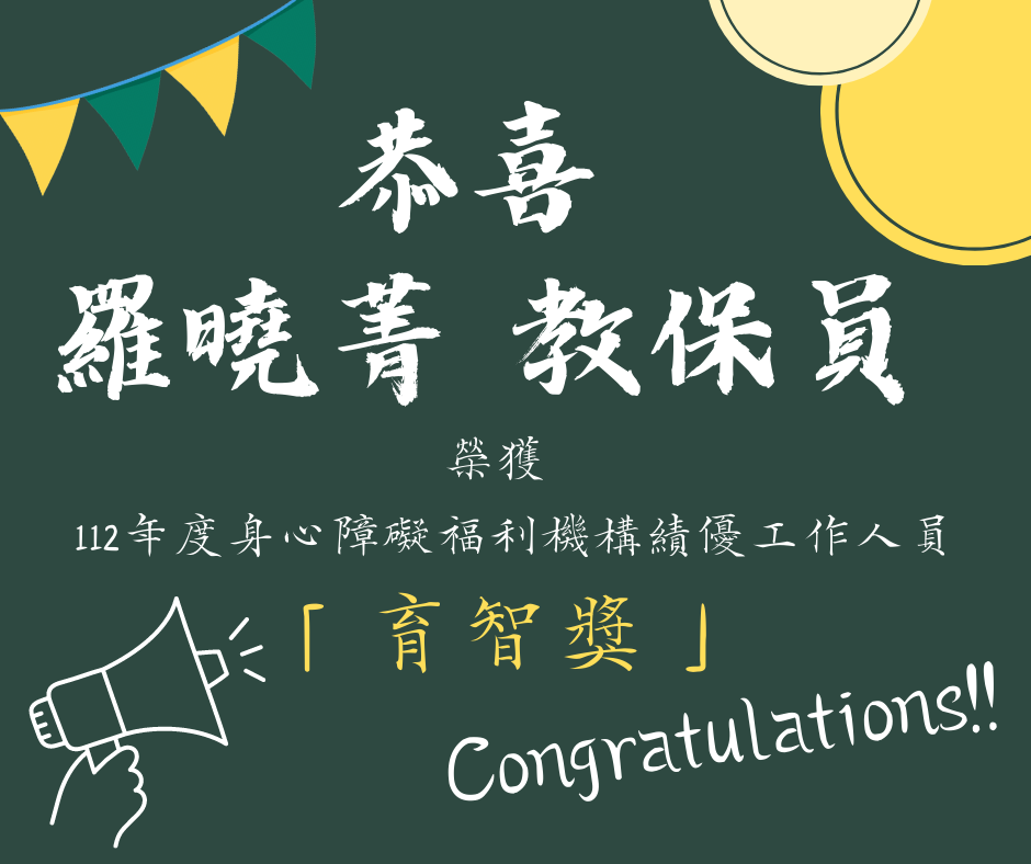 榮獲 112年度身心障礙福利機構績優工作人員「育智獎」!