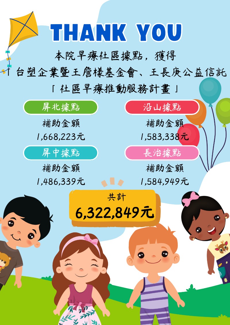 本院屏北、沿山、屏中、長治早療據點,獲得「台塑企業暨王詹樣基金會、王長庚公益信託「社區早療推動服務計畫」補助金額共計:6,322,849元。