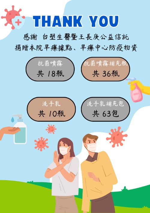 感謝 台塑生醫王長庚公益信託捐贈本院屏中據點、屏北據點、沿山據點、長治據點、勝利之家早療中心防疫物資物資共計:抗菌噴霧18瓶 抗菌噴霧補充瓶36瓶洗手乳10瓶 洗手乳補充包63包