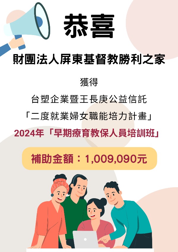 恭喜本院 財團法人屏東基督教勝利之家獲得台塑企業暨王長庚公益信託「二度就業婦女職能培力計畫」2024年「早期療育教保人員培訓班」補助金額:1,009,090元。#台塑企業 #王長庚公益信託