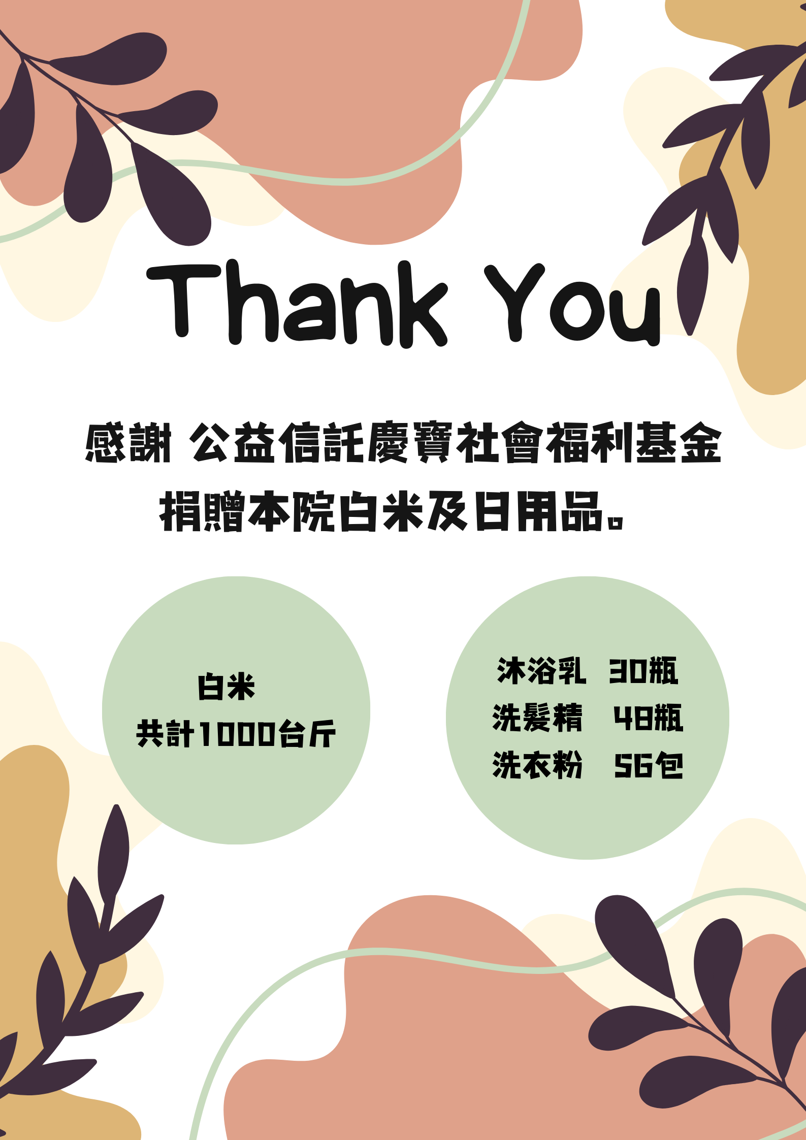 感謝 公益信託慶寶社會福利基金 捐贈本院白米及日用品