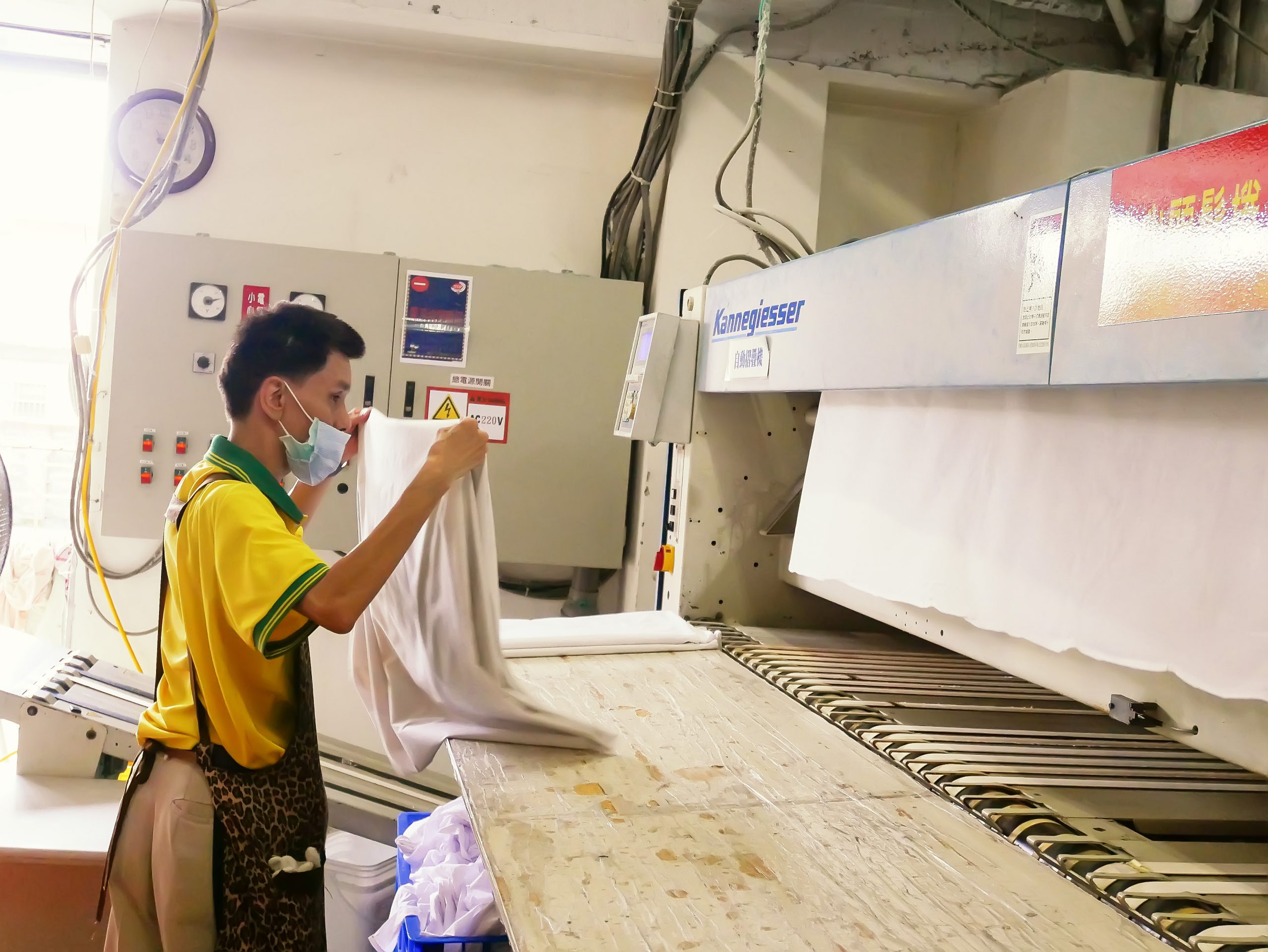 飯店的床單、枕巾、被套…等,經過輪燙機跟摺疊機的全自動作業,庇護工作者能輕鬆在後端接住輪燙出的布品,再重新加以整型,快速又整齊。