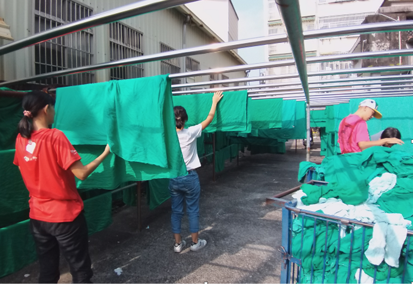 庇護工作者把一件一件的床單高掛曬衣架,讓熱情的陽光幫忙晒乾,,使每件床單充滿太陽溫暖的香氣。
